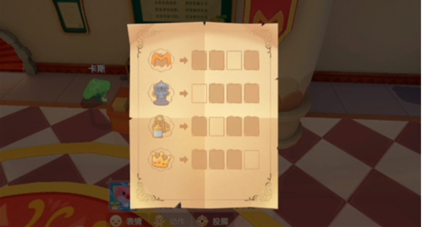 摩尔要在城堡大厅内,寻找这些场景物的数量,M有6个,骑士有4个,路灯有4个,皇冠有3个,将其组合排列之后,最后得出的密码就是4463。