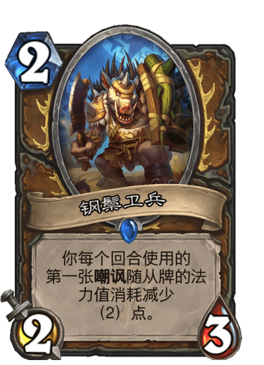 新卡【钢鬃卫兵】是一张很强的节奏卡,尤其在配合两费嘲讽怪可以瞬间铺两个怪,嘲讽怪还能保护【钢鬃卫兵】效果再次触发。新橙卡【古夫符文图腾】配合自然法术在铺场体系里是很强的爆发点。这两张牌的加入带来了一个区别于法术超生德的铺场体系。
