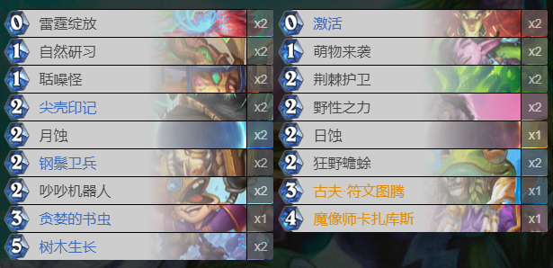 因为失去了【乘风而起】加上【猜重量】不适合体系,这套牌对比于法术超生德缺过牌,所以更依赖前期爆发。带了【魔像师卡扎库斯】是因为没有别的4费牌,而且【魔像师卡扎库斯】有两个选项非常适合这个卡组。一个是抽卡,一个是加buff。
