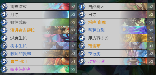 跳费体系的德鲁伊失去了一张很重要的牌:【溢流】。失去了【溢流】意味着跳费体系失去最重要的过牌手段,再看看下版本能用的牌会发现德鲁伊过牌不那么容易了(除非玩法术体系),所以要玩跳费体系我认为必然要带【动物保镖】体系。