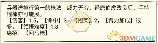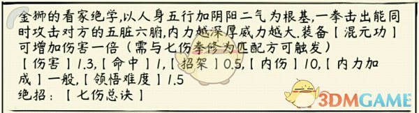 〔伤害〕1.3,〔命中〕1,〔招架〕0.5,〔内伤〕10,〔内功加成〕一般,〔领悟难度〕1.5
