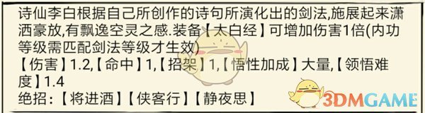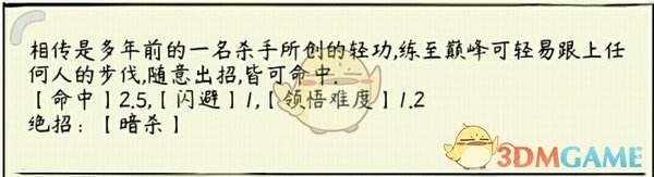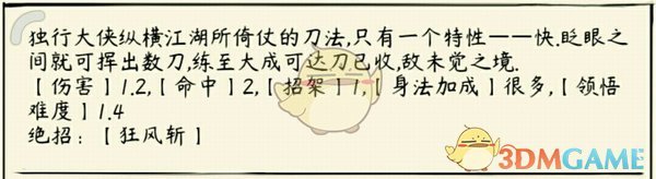 [伤害]1.2,[命中]2,[招架]1,[身法加成]很多,[领悟难度]1.4