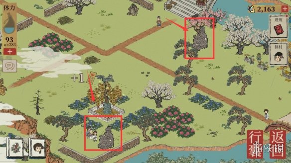 2)、把这两个石像修好,就可以解除迷雾,然后在小树林就能找到铲子了。