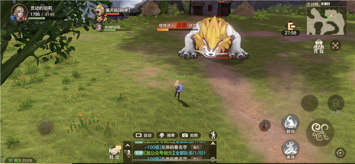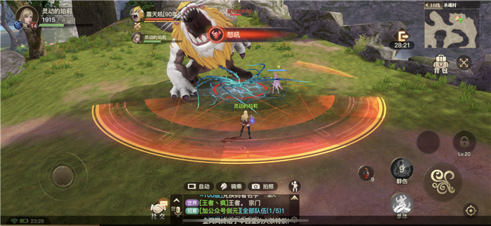 当玩家战胜炽火雄猴后就会越到震天吼,这个boss的特点是防御力超高,且震天吼技能攻击范围极大,释放时间短,所以当玩家近身攻击震天吼时一定要防范他发动技能震天吼技能范围成一个巨大圆形。
