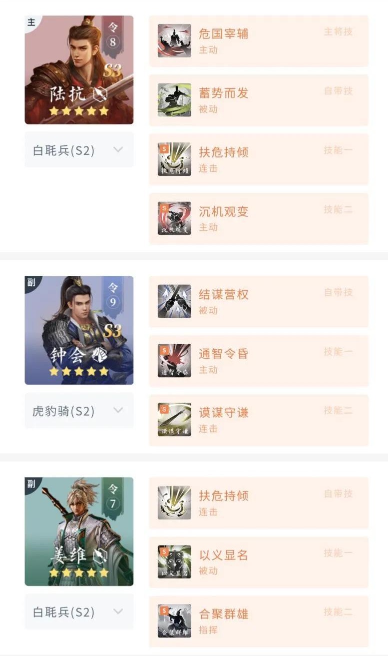 该阵容主打智力连击与爆发,陆抗通过友方释放连击武技获得各种智力类增益,钟会则共享其增益。双C的输出能力随战斗进行而提升,扶危持倾与以义显名的治疗效果都可让钟会共享,整体输出与续航都非常不错。
