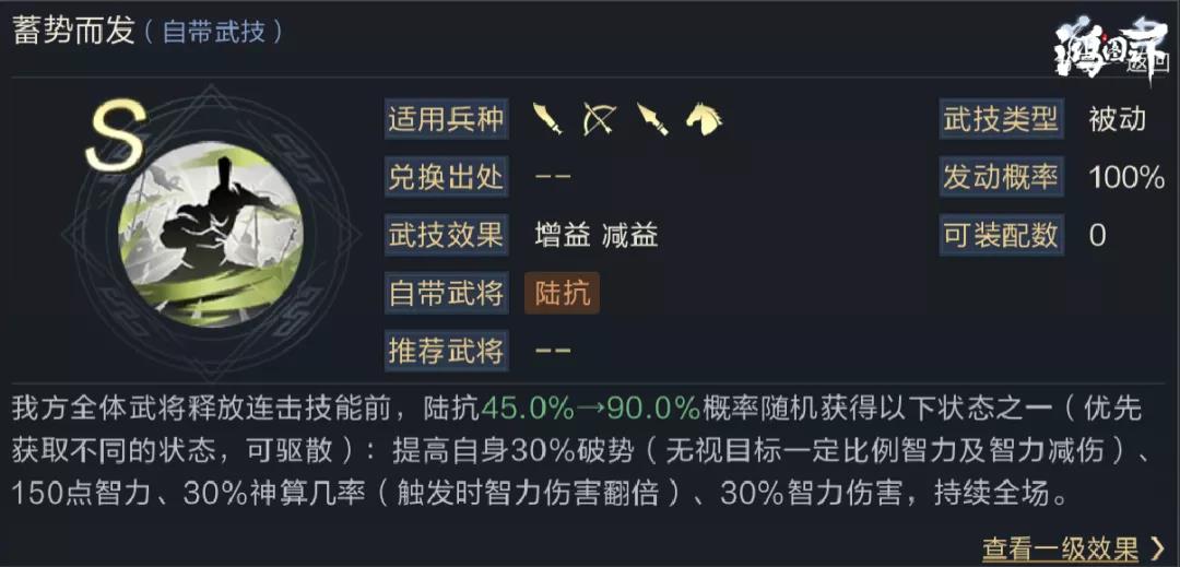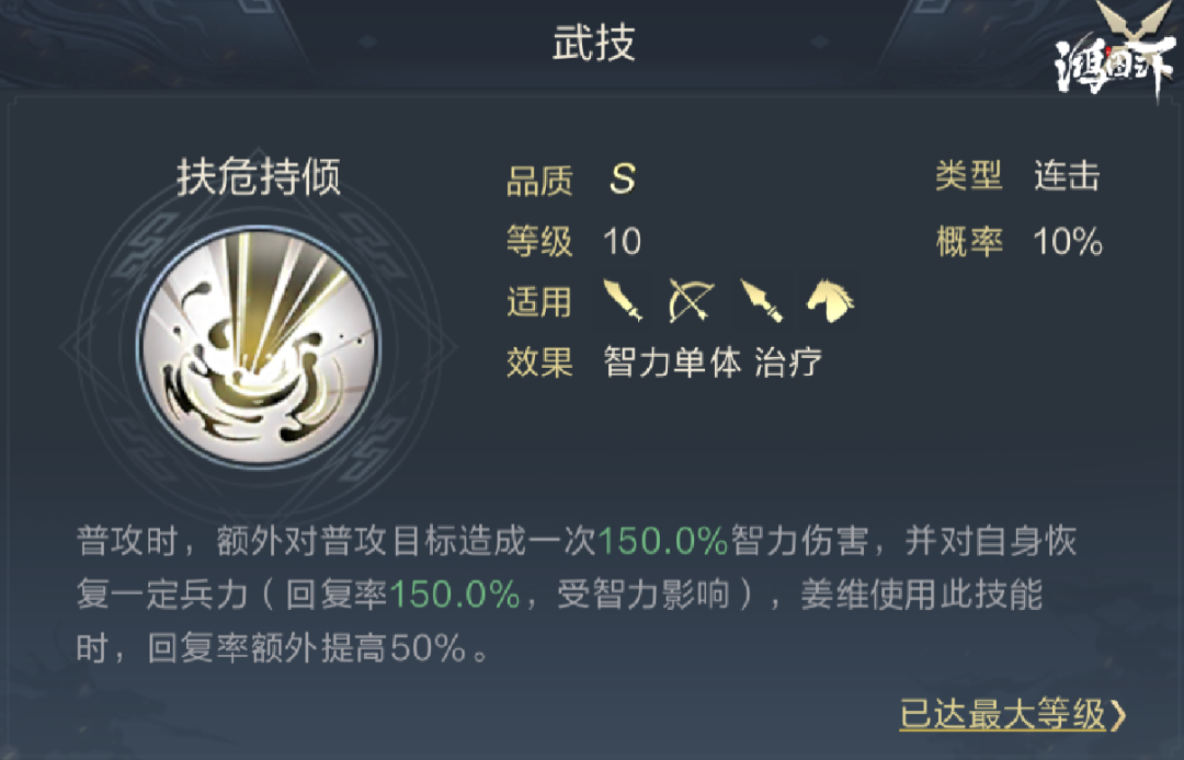 1号武技推荐扶危持倾,该技能兼并输出与恢复,能提高陆抗与钟会的续航能力,保证不被爆头。属于连击技能,可触发蓄势效果。