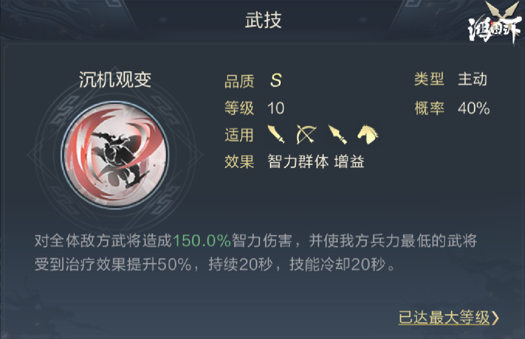 2号武技推荐沉机观变,该技能拥有非常高的AOE伤害,总伤害率可达到450%,加上蓄势效果与通智的减智效果,触发神算时可直接清场。队伍三人均拥有治疗能力,能提升实际恢复效果。