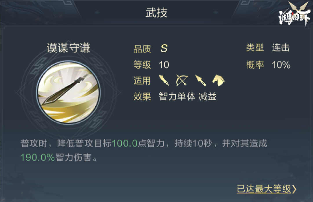 2号武技推荐谟谋守谦,该技能可降低当前目标智力,与陆抗同列时具备针对效果,可显著强化两人的输出,对蓄势的触发也有帮助。