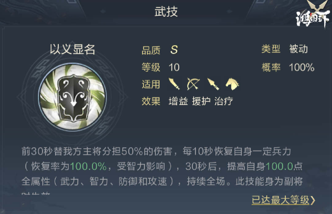 1号武技推荐以义显名,该技能可在前30秒让姜维为陆抗分担大量伤害,30秒之后姜维可获得大量属性提升。该效果可被钟会共享,可直接提升两名角色的战斗能力。