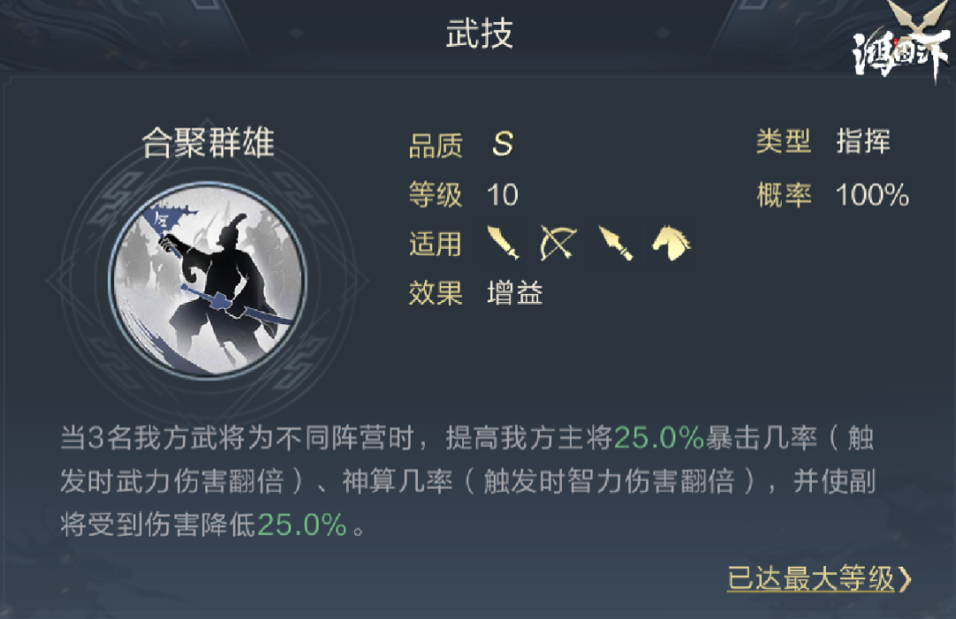 2号武技推荐合聚群雄,该技能可为副将提供25%的减伤,为陆抗提供25%的神算。当陆抗获得蓄势中的神算加成后,配合该技能有55%的几率触发翻倍伤害,提升非常显著。