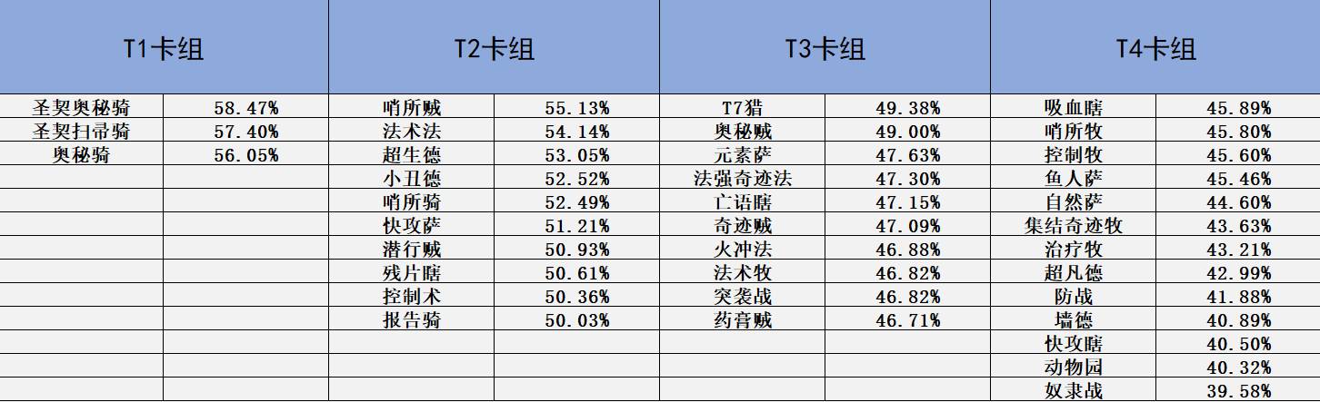 圣契骑这个曾经的热门体系在新环境仍然表现的如鱼得水,尽管失去了【萨赫特的傲狮】这一检索手段,卡组灵活性发生了降低。但奥秘体系的登场和一些强力的圣骑士单卡反而将圣契骑推上了当前版本胜率第一的宝座。