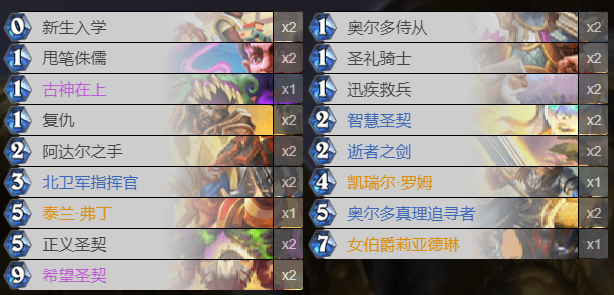 一部分构筑选择了携带奥秘体系,【逝者之剑】直接从牌库中检索奥秘并置入战场的特效在有相当强度之余,还有压缩牌库的效果。辅以【圣礼骑士】检索神圣法术、【北卫军指挥官】检索随从,【泰兰弗丁】定向检索【女伯爵莉亚德琳】。这样层层的检索体系让这个卡组的稳定性甚至不比之前要低。
