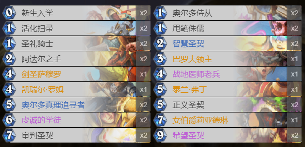 有些人可能会好奇为什么4费只带了一张【凯瑞尔罗姆】,而不去带现在大火的【魔像师卡扎库斯】。实际体验几局立刻就会发现,被减1费的【正义圣契】会干扰【魔像师卡扎库斯】的触发,而这张卡的期望正是四五费连牌,【奥尔多侍从】更是无论什么情况都起手要保留的一张牌,普遍情况下都会干扰到【魔像师卡扎库斯】的触发,因而选择不去携带。