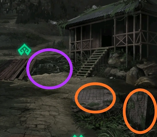 密码打开门,得到道具装在水井上。查看灯笼线索。粉色方框缸内有虫子。