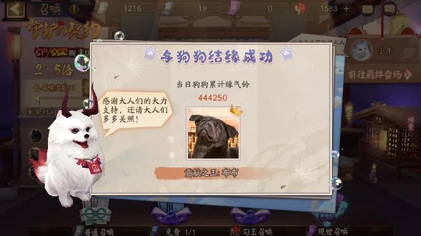 大人们获取的「缘气铃」将自动累计至选择的小动物身上,猫猫们和狗狗们的「缘气铃」将分别进行累计。大人们可在每日首次进入召唤小屋时,查看前一日的「缘气铃」累计成果及贡献最多的小动物。