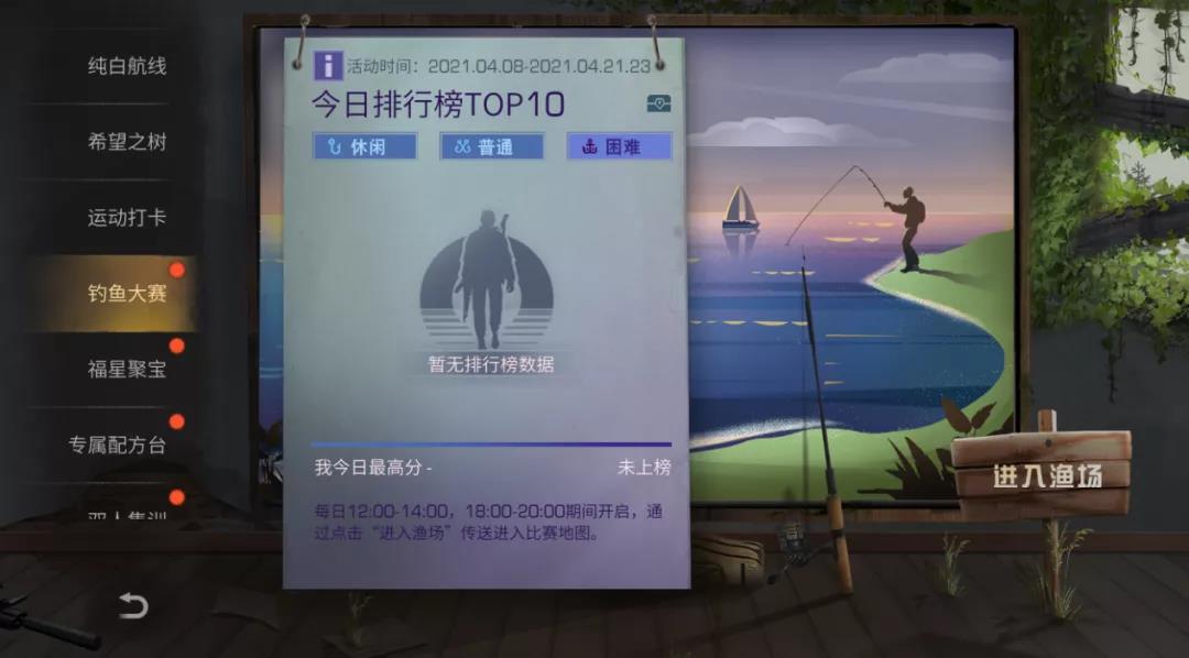 幸存者只能在12:00-14:00及18:00-20:00从快乐101或者营地通过钓鱼大赛页面进入渔场。