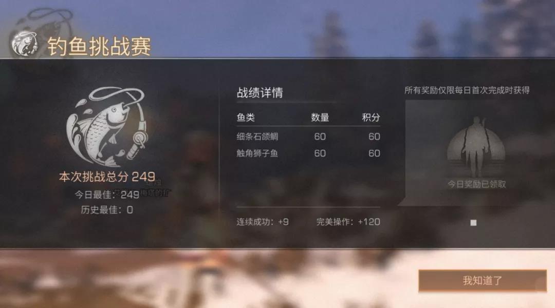 幸存者还能通过左上角的得分板随时得知自己的钓鱼得分,每日首次完成钓鱼挑战赛还能够获得额外奖励。
