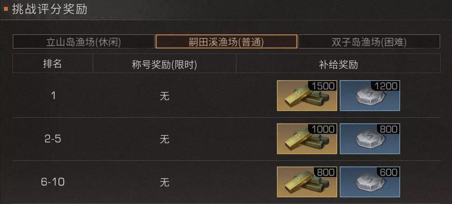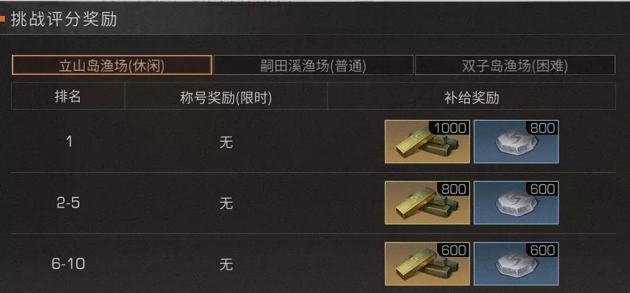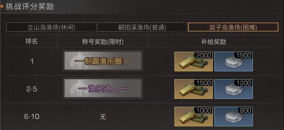 联盟为三个渔场的前十优胜者准备了数量不等的金条和技能点奖励,在双子岛渔场获得前五名的幸存者更是能获得特殊称号奖励。