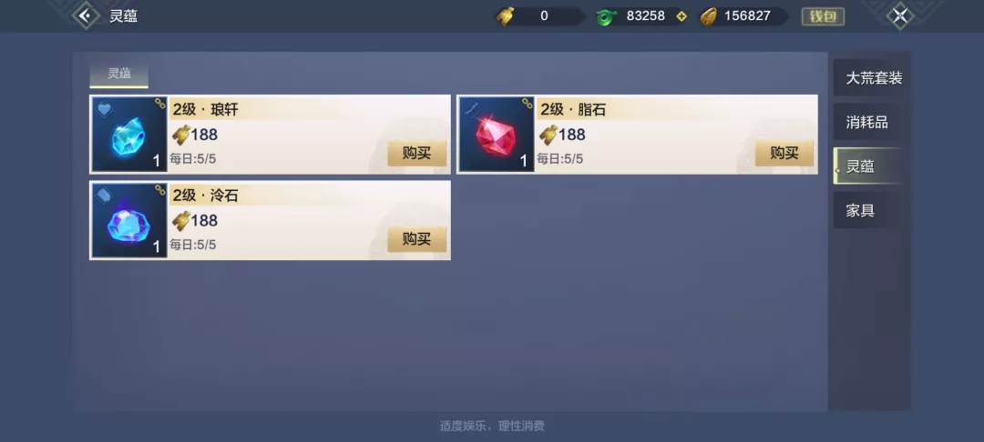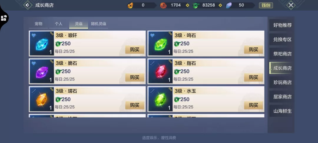 旅者通过进入系统商店,选择『成长商店』,在栏目中可以看见『灵蕴』和『随机灵蕴』两个栏目,旅者可以通过支付一定数量的脂玉来获得自己所需的灵蕴,也可以通过支付一定数量的灵蕴精华,来购买不同品质的随机灵蕴礼包