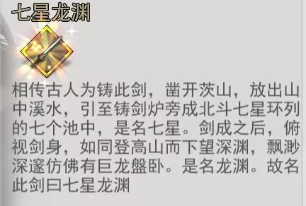 剑成之后,俯视剑身,如同登高山而下望深渊,飘渺深邃仿佛有巨龙盤卧。是名龙渊。故名此剑曰七星龙渊。