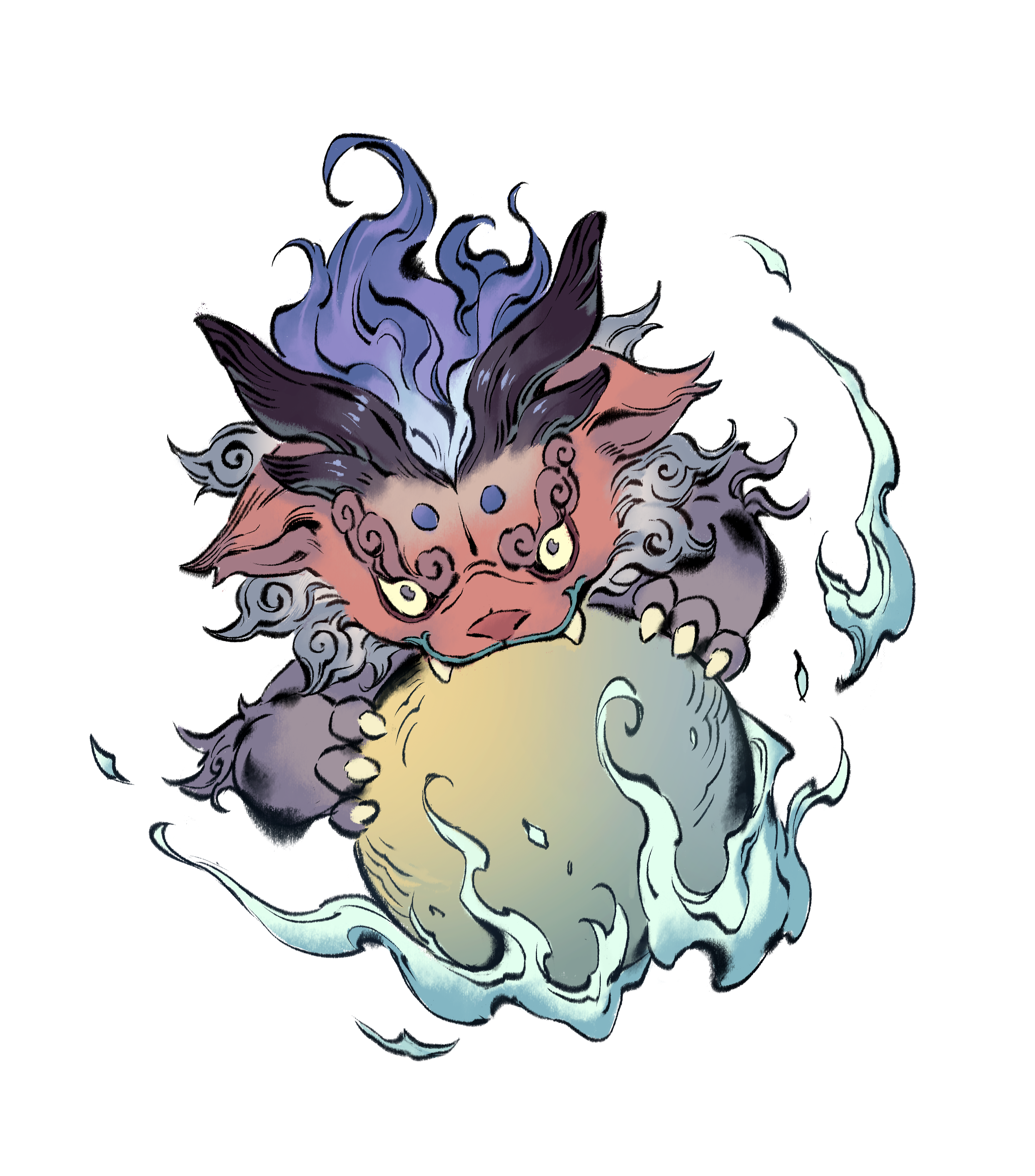 紫炎狮的原型出自《山海经》,是为龙之五子狻猊,它拥有夸张的冠型,与龙和狮都有几分相似,看似嚣张跋扈的外表却独爱安静,尤好蹲坐,酷爱烟火之气。为了时刻能感受到焚香之乐,它常自身携带一如球般的铜制香囊,爱不释手。