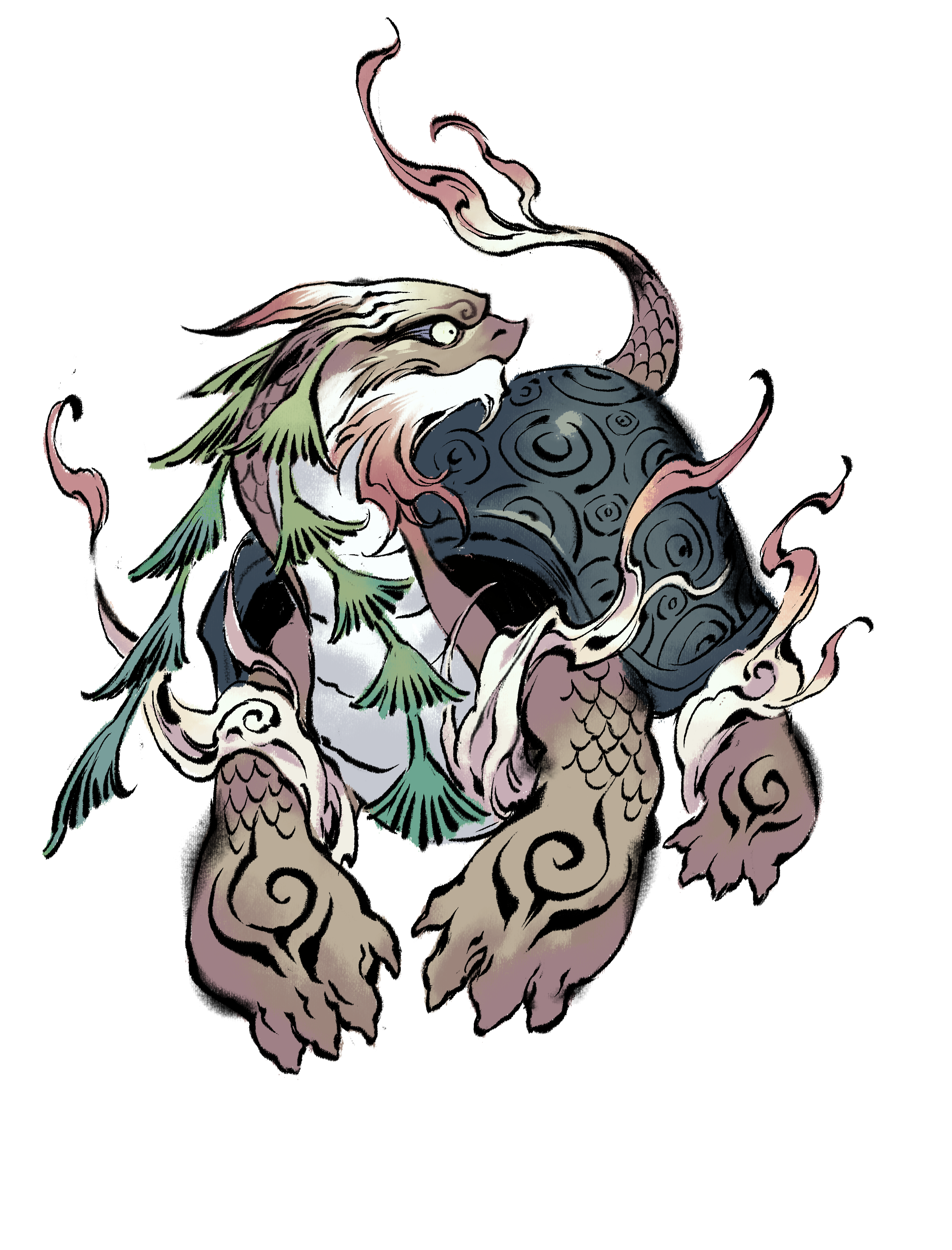 与其他灵兽不同,化为人形的天玄魔龟,却褪去二阶灵兽时的威风,返璞归真,貌似孩童,却白眉如须,手脚着金环,衣饰祥云,象征长寿与坚韧的龟壳化为饱满的包裹挂在双肩,他的到来将予以人们祥瑞长寿之气。