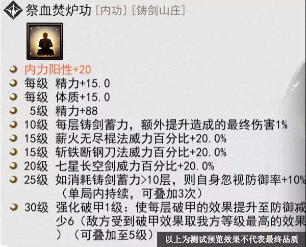 铸剑最强大的内功,对铸剑奇门、刀法、剑法可提供大量加成,主动使用可附加大量增伤。