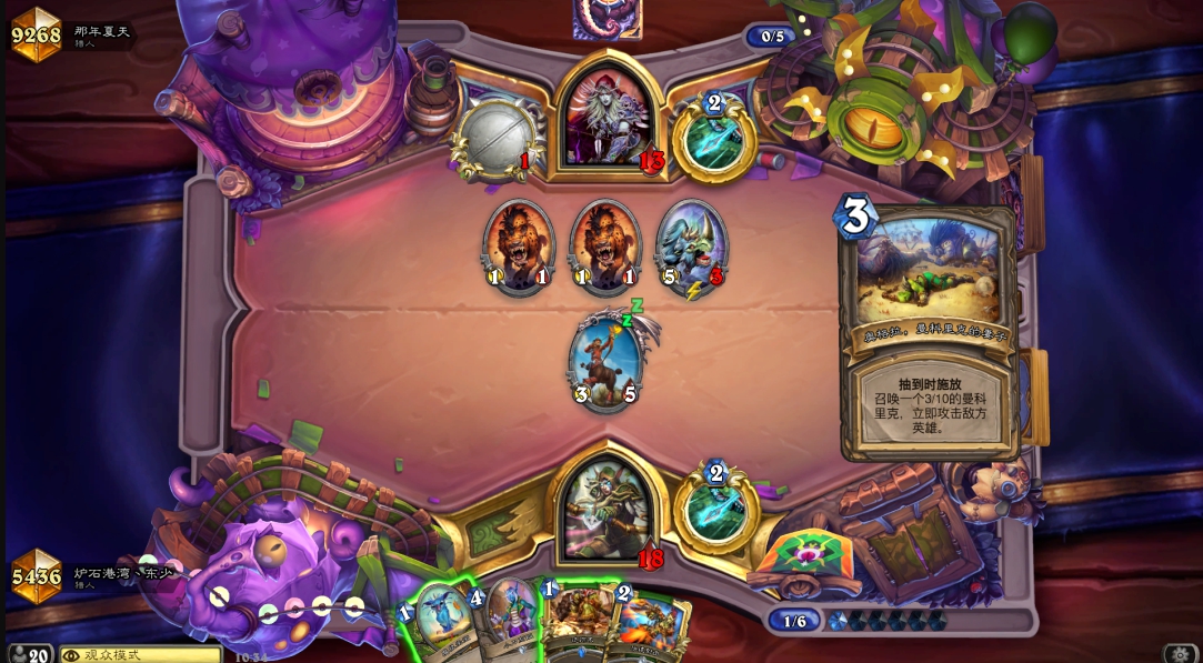 检索到老婆之后,召唤一个3/10的曼科里克,另外还能再抽一张牌(不局限于法术)。这就相当于5费打出一个3/5随从,一个3/10随从+打脸,还能抽两张法术和一张随机牌。