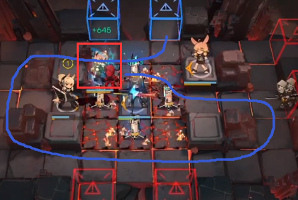 开局如下图所示位置下德克萨斯,然后剑雨好了就放,产生的COST放四个朝向德克萨斯的充能器,利用剑雨的晕眩和地火的伤害打死第一个大锤哥。