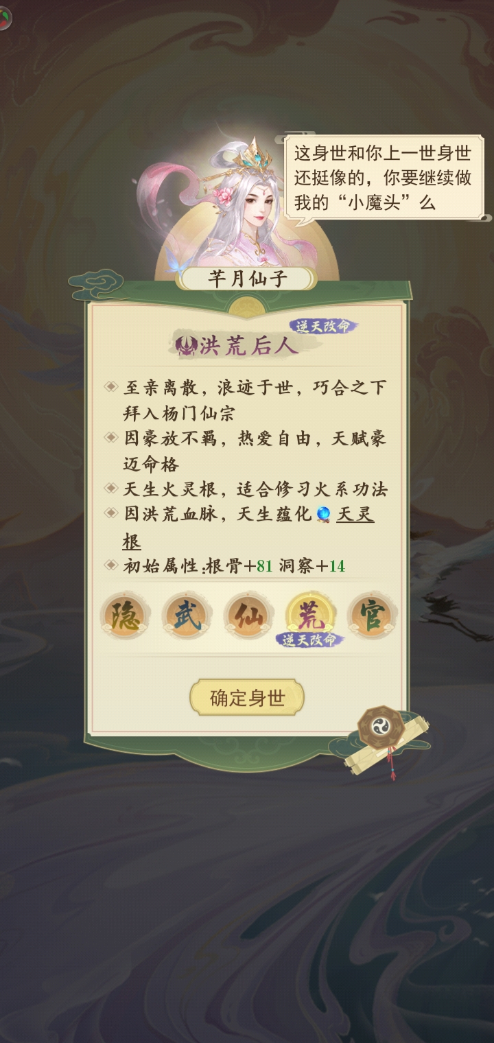 需要注意,出身一旦选择好了就不能更改了,这个会影响到玩家初始属性,前期影响大得多,都氪金情况下其实哪个出身都可以考虑玩。