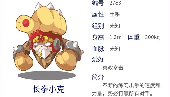 1、长拳小克是一位土属性物理伤害宠物,可以给敌人造成伤害的同时降低敌人防御。