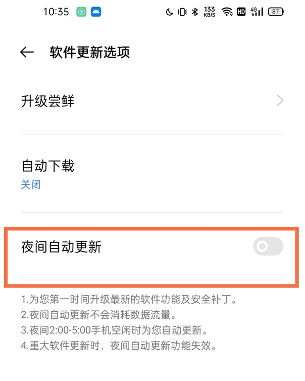 3、将【夜间自动更新】右侧的开关关闭即可。