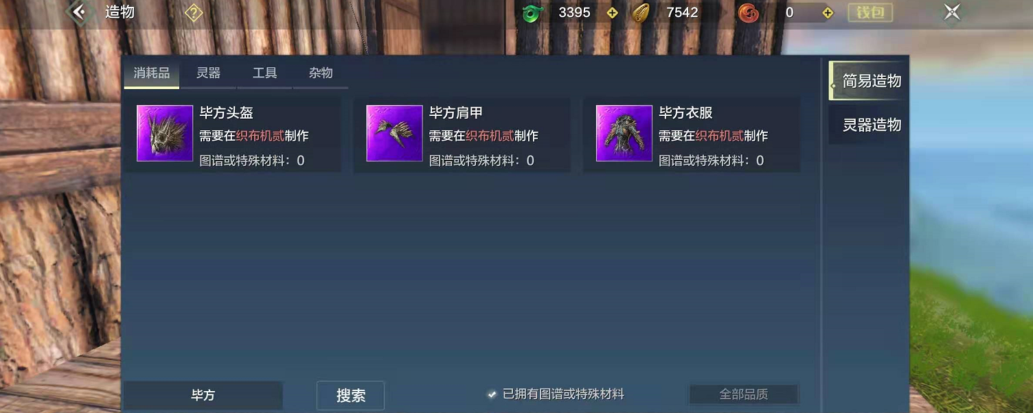 1、首先得获得制作“毕方装备”的基本材料,其中“毕方头盔”需要毕方头盔图谱*1+千年兽魂*1赤白喙*5+卓越布料*1+黄金甲片*2;“毕方肩甲”需要毕方肩甲图谱*1+千年兽魂*1+赤白喙*5+卓越皮料*1+黄金甲片*2;“毕方衣服”需要毕方衣服图谱*1+千年兽魂*1+赤白喙*5+卓越皮料*1+黄金甲片*2。