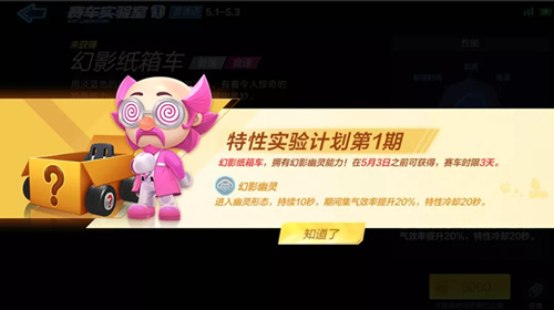 车友们5月3日之前,可以在赛车实验室领取到——幻影纸箱车进行体验,赛车体验时长为3天,车技超凡的车友们快来帮帮R博士,一起进行赛车实验吧!