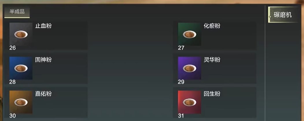 1、游戏中“碾磨机”可以用来制作各种药品的粉末,例如止血粉、化瘀粉、固神粉、灵华粉、嘉佑粉、回生粉等,其中每种药粉所需要的材料各不相同。