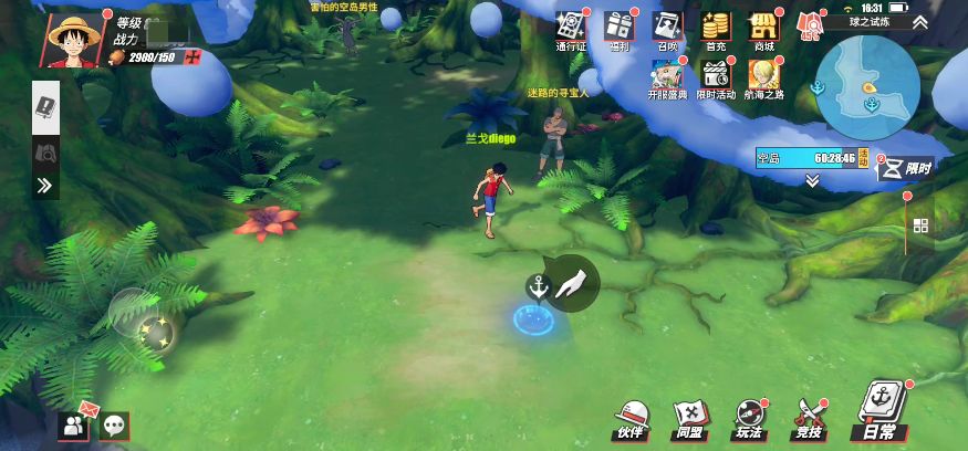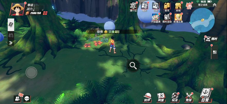 在击败它之后,我们继续往前面走,然后再往右边走。在走的时候,大家会遇到一个特殊的交互提示。玩家需要点击探索,然后打开云朵,就会多得2万贝里。