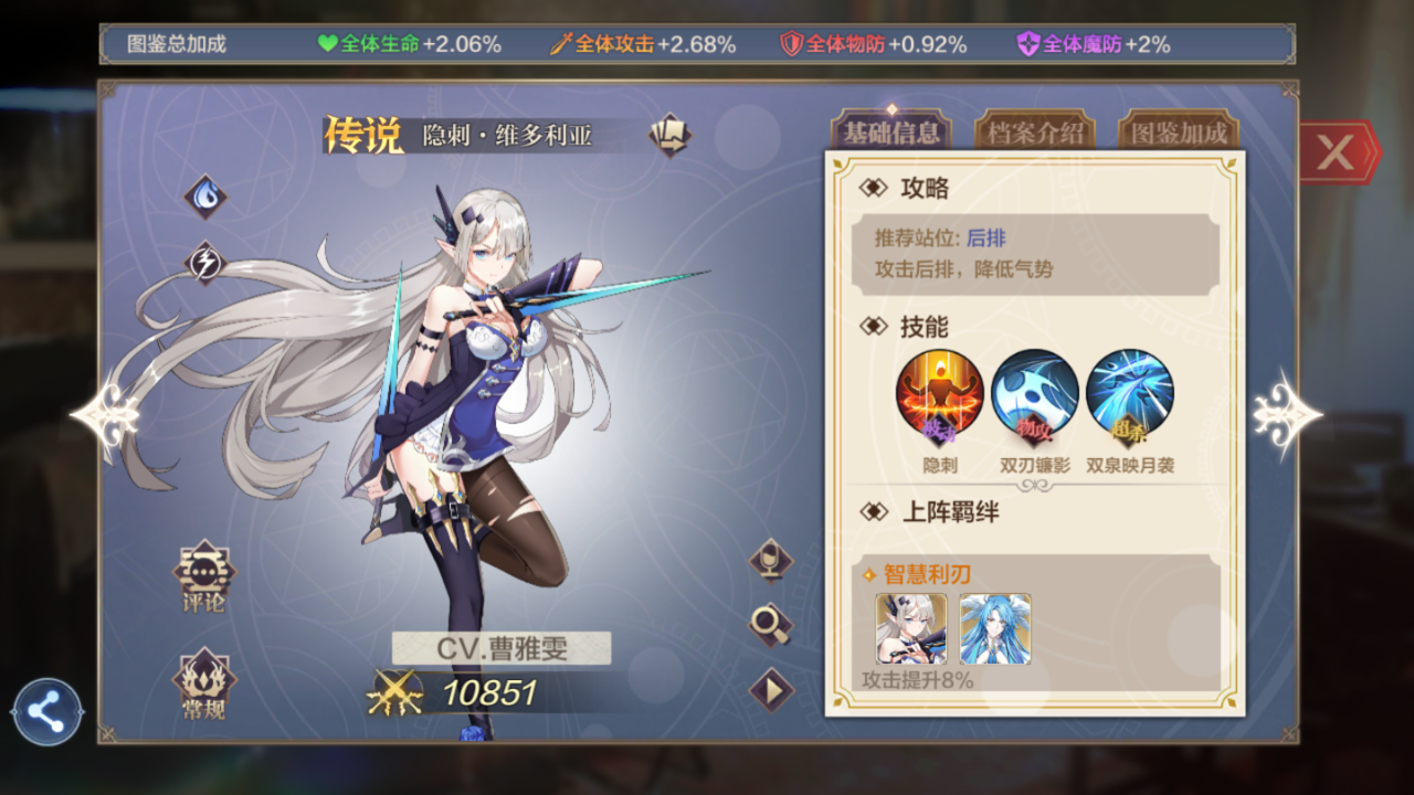被动:每回合开始加20%闪避 最高三层60% 闪避后减一层(拼脸 脸好 前两回合全闪 但加不了气势 尴尬)普攻120%伤害(无视)大招单体伤害加提升自身20%闪避(持续两回合)