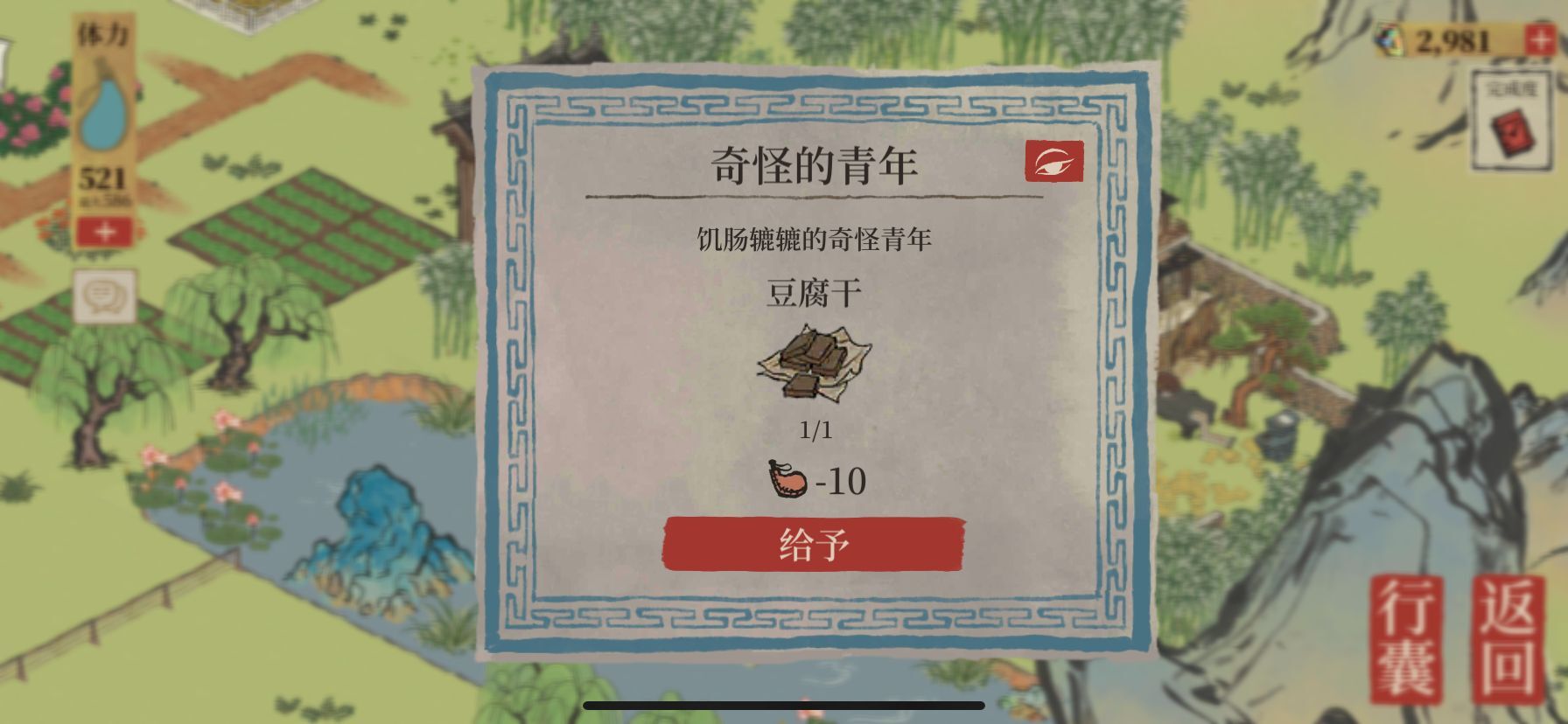 在右上角多了一块迷雾,点击迷雾前的牌坊,然后进入,在第三个房子兑换豆腐干,然后将豆腐干交给奇怪的青年,和奇怪的青年对话,交付20个金圣叹的短评,可以获得人物金圣叹。
