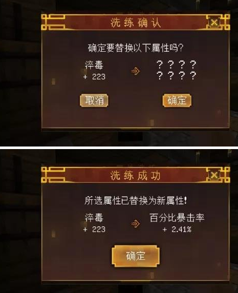 比如我想洗掉这把武器的“淬毒”属性,只要将其勾选,点击下方的“开始洗练”,再点击“确定”,便能将其替换为一个全新的属性。当然,会出现什么属性也是完全随机的,可以说纯靠运气。