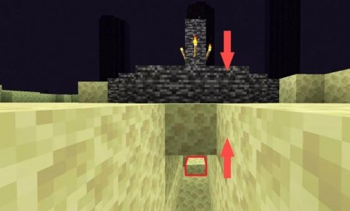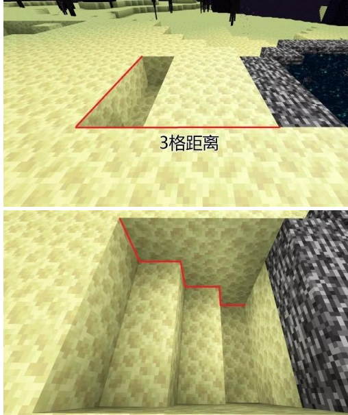 首先“准备”一个末地传送门,选定在距离传送门三格的位置以台阶的形式向下挖掘,直到挖到传送门另一端。