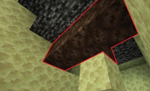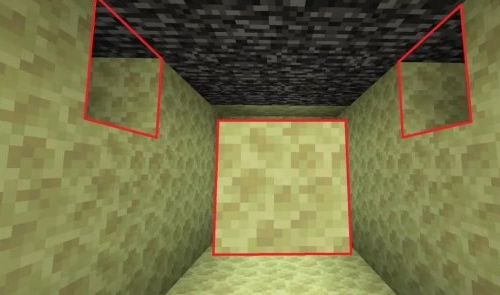 然后在定位方块的高一格位置,摆放一个方块,并将两侧划红线区域的方块挖掉。
