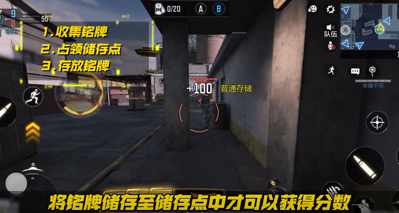 该模式下,己方战士需要收集铭牌,并将收获的铭牌储存至A点或B点中获得分数,而率先达到分数上限或比赛时间结束时,分数高的一方获得最终胜利。
