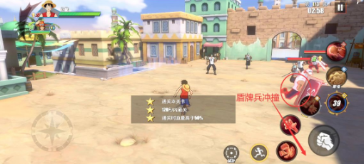 当然,玩家若是没有鳄鱼的友情技能帮助,那也没关系。玩家将盾牌大兵勾引过去之后,直接冲到炮弹大兵前,利用【橡皮·抓】来获得输出空间。在攻击的时候,一定要留意他的炮弹,因为在护盾保护的情况下,我们的普攻是无法打断的,只能闪避,或者【橡皮·抓】打断。