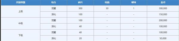 不同等级的灵晶在激活和觉醒时消耗的资源不同。灵晶结合必须在猫神神社进行操作。