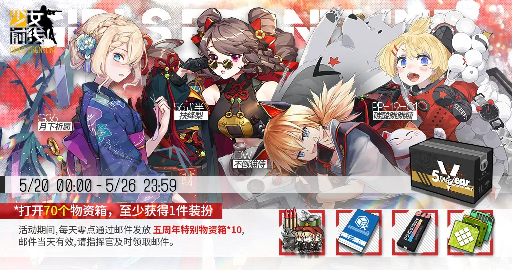 活动期间,每天零点通过邮件发放五周年特别物资箱*10