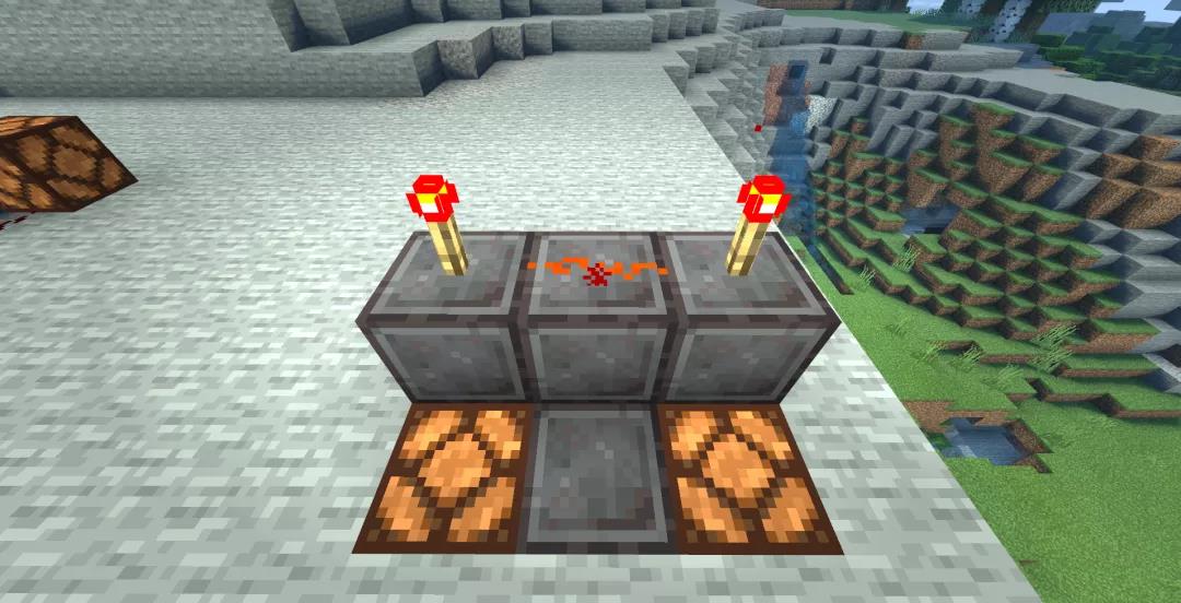 接着在普通方块的后端摆放两个红石火把,用红石粉将信号引出。