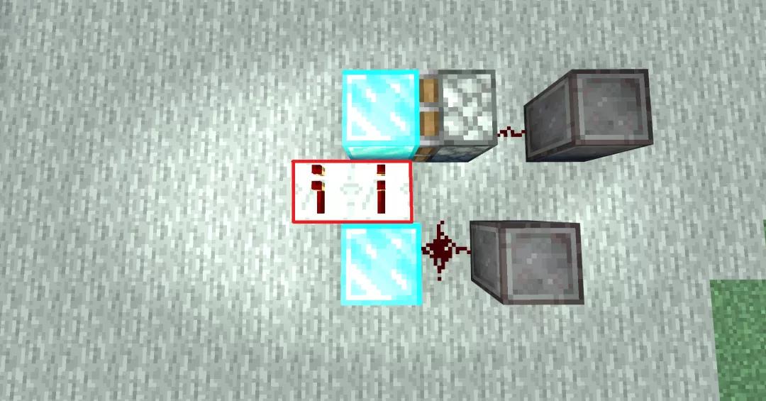 在图示位置,摆放两个普通方块,用红石粉来连接两个红石火把。