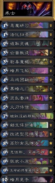 当然,在补丁之后所衍生出来的新卡组里,这一套混乱套牌控制术,可以说是让我感觉到惊喜的心爱之物。与其说是控制术,不如称之为中速的恶魔术。与天梯上原有的控制术的残片体系回血、满编解牌解场并通过提克特斯撕牌和大王压制赢得胜利不同,这一种混乱套牌控制术的思路,就是交换。