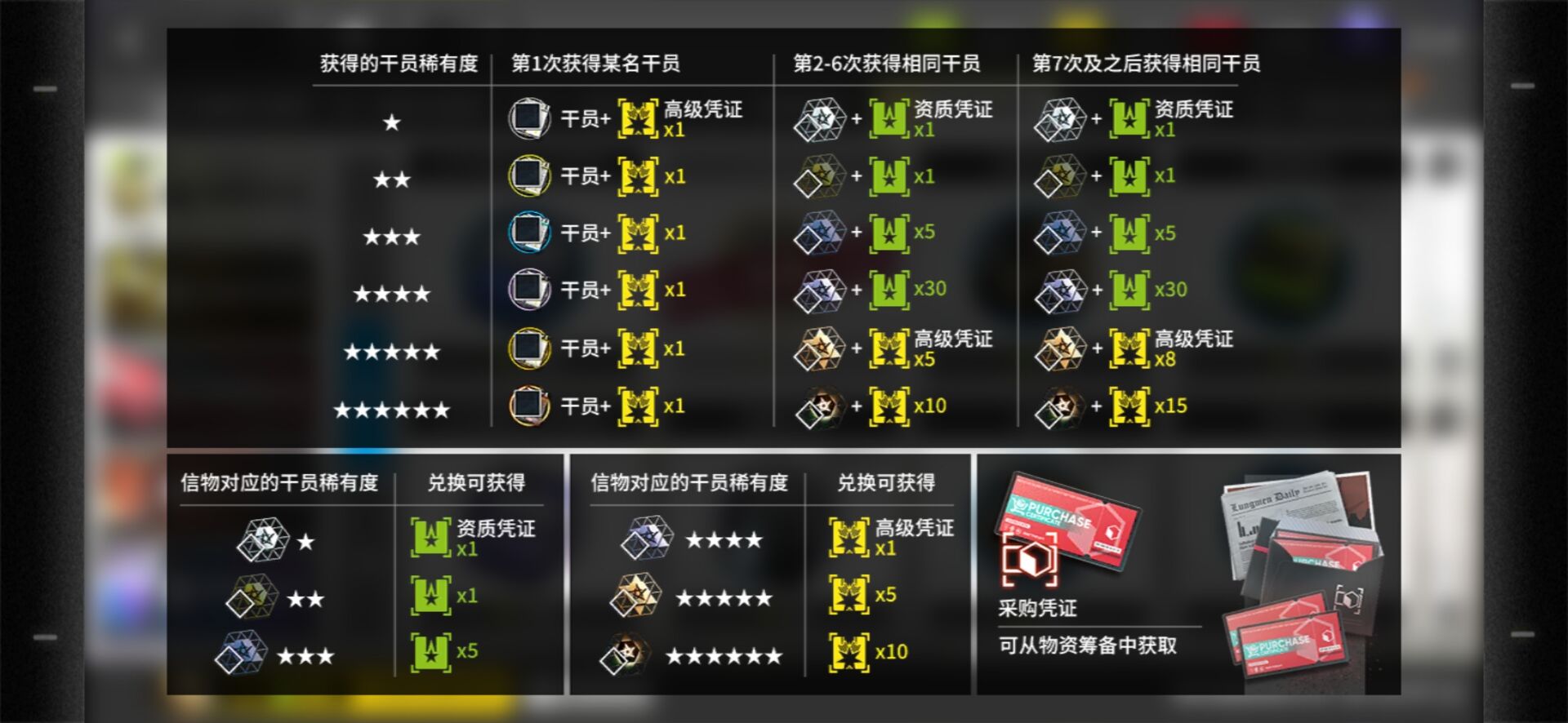 2、信物兑换:玩家在4星及以上干员满潜之后重复获取可以用其信物兑换黄票;