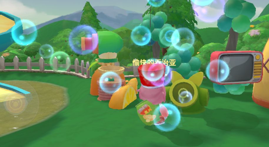 派对广场就是NPC琦琦的所在地,里面充满了各种各样的小彩蛋。比如触摸这个绿色的泡泡机,机会持续五秒吹出泡泡。广场中的小木马、摇摇车、大西瓜都可以触发小彩蛋哦!